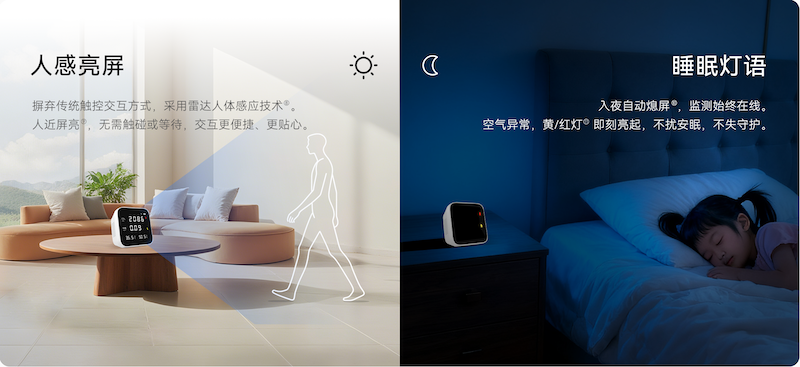 作為首款采用雷達人體感應(yīng)方案的空氣質(zhì)量檢測儀,為用戶提供了“人近亮屏、人走熄屏”的人性化無感交互體驗,大幅提升了產(chǎn)品使用的便捷性。屏幕隨人明滅,拒絕過多的光源分散注意力,助力打造輕松舒適的居家氛圍。