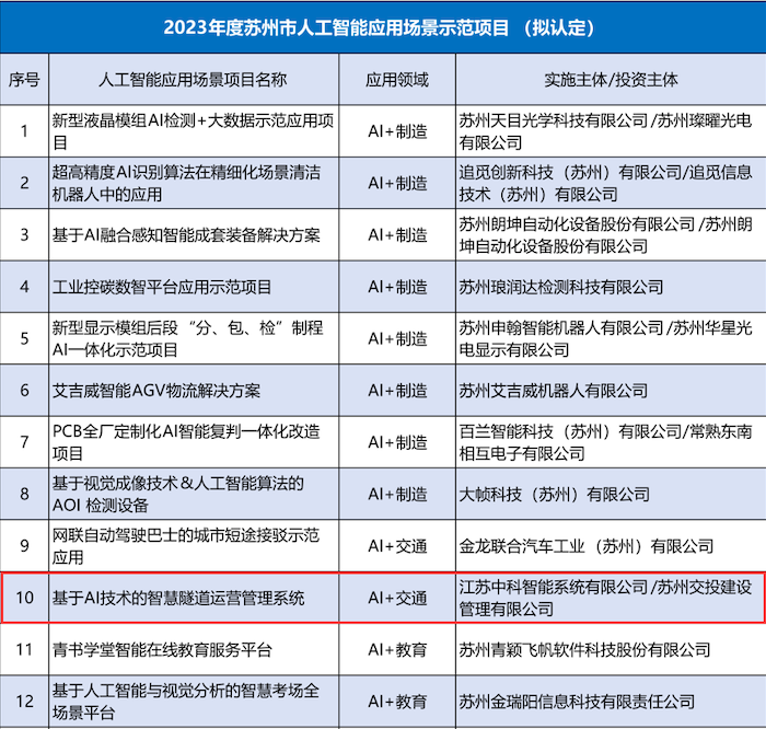 近日,2023年度蘇州市人工智能應(yīng)用場景示范項目名單公布,中安科子公司中科智能與蘇州交投建設(shè)管理有限公司聯(lián)合申報的“基于AI技術(shù)的智慧隧道運(yùn)營管理系統(tǒng)”通過評審,成功入選人工智能應(yīng)用場景示范項目。