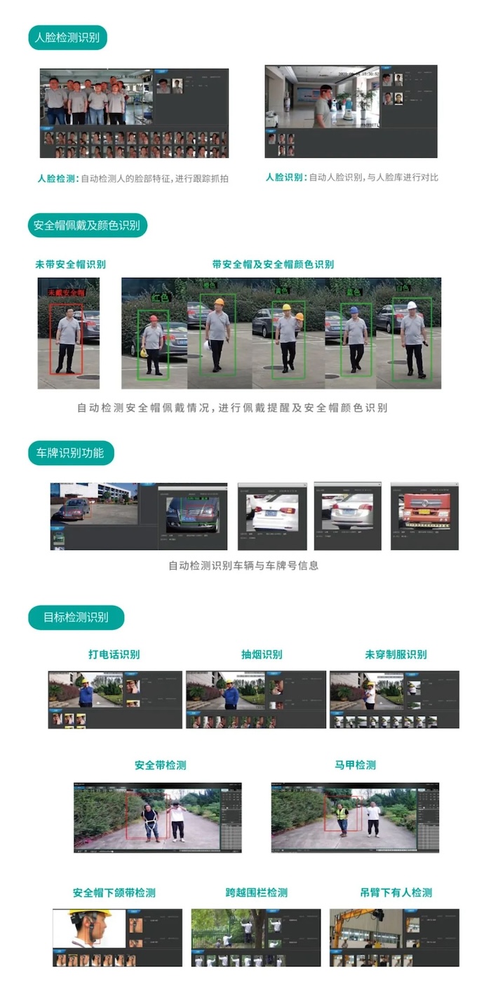 AI算法用于電力作業(yè)現(xiàn)場(chǎng)可實(shí)現(xiàn)人臉檢測(cè)、人臉識(shí)別、車牌識(shí)別、安全帽佩戴情況及安全帽顏色識(shí)別,以及打電話、吸煙、制服穿戴、安全帶佩戴、馬甲穿戴等多類目標(biāo)檢測(cè)識(shí)別功能。